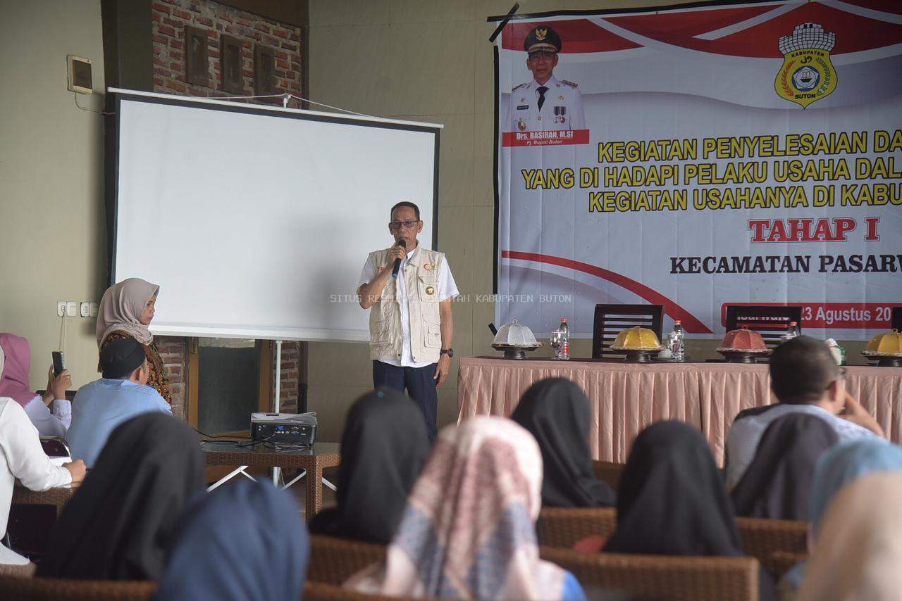 Pj. Bupati Buton, Drs Basiran, MSi membuka kegiatan Tahap Pertama Penyelesaian Permasalahan dan Hambatan yang dihadapi pelaku usaha dalam merealisasikan usaha , yang digelar di Aula Rumah Makan Silvana, Pasarwajo, Kabupaten Buton, Rabu, 23 Agustus 2023.