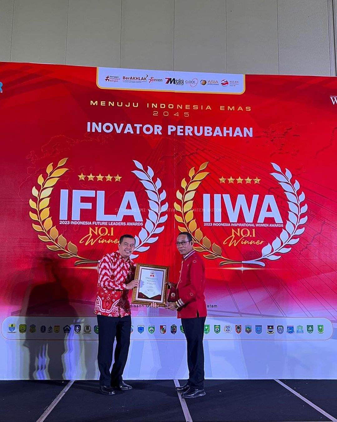 Pj. Bupati Buton Drs. Basiran, M.Si. menerima penghargaan dari Lembaga Seven Media Asia sebagai Inovator Perubahan dalam penganugerahan Indonesia Best Future Leaders, di Radison Golf & Convention Center Batam, Batam, Provinsi Kepulauan Riau, Jumat malam, 28 Juli 2023.